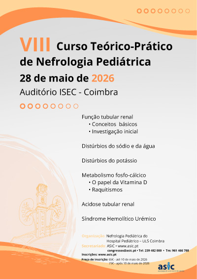 O VIII Curso Teórico-Prático de Nefrologia Pediátrica realizar-se-á a 28 de maio de 2026 no Auditório ISEC, em Coimbra, focado na função tubular, distúrbios de eletrólitos (sódio, potássio), metabolismo fosfo-cálcico, raquitismos e síndrome hemolítico-urémico.